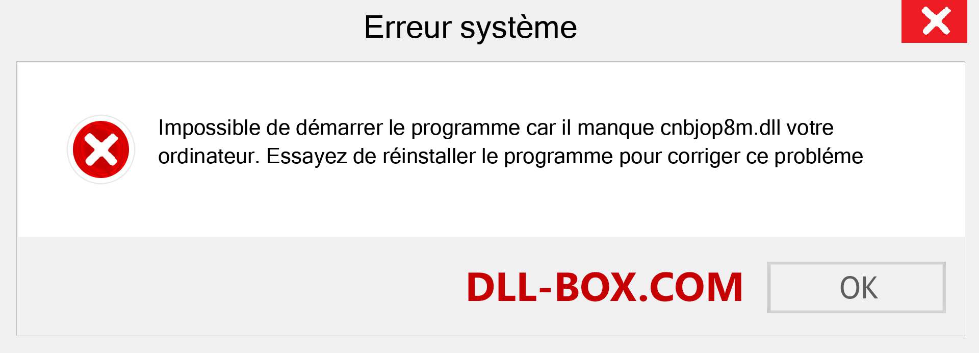 Dans la grande majorité des cas, la solution consiste à réinstaller correctement cnbjop8m.dll sur votre PC, dans le dossier système de Windows. Alternativement, certains programmes, notamment les jeux PC, nécessitent que le fichier DLL soit placé dans le dossier d'installation du jeu/application.